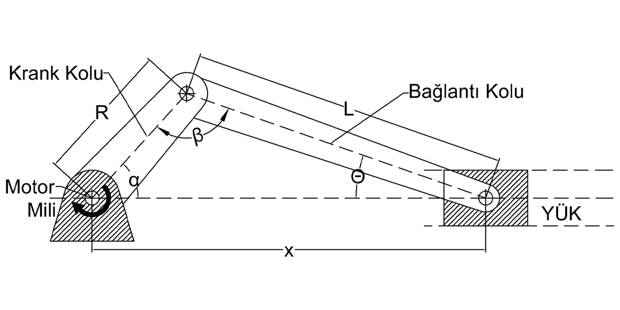 Krank biyel mekanizması krank ve bağlantı kolları olmak üzere iki kol ve bu iki kolu birbirine sabitleyen bir milden oluşur. Hareketi bir motor tarafından kontrol edilebilen krank kolunun dönmesiyle, bağlantı kolu yükü iter ve yük harekete geçer. Tabii ki bu hareketin kontrol altında gerçekleşmesi için bir takım hesaplamalar yapılmalıdır. Bu noktada referans alacağımız veriler motor milinin kaç derece döndüğü ve açısal hızıdır.